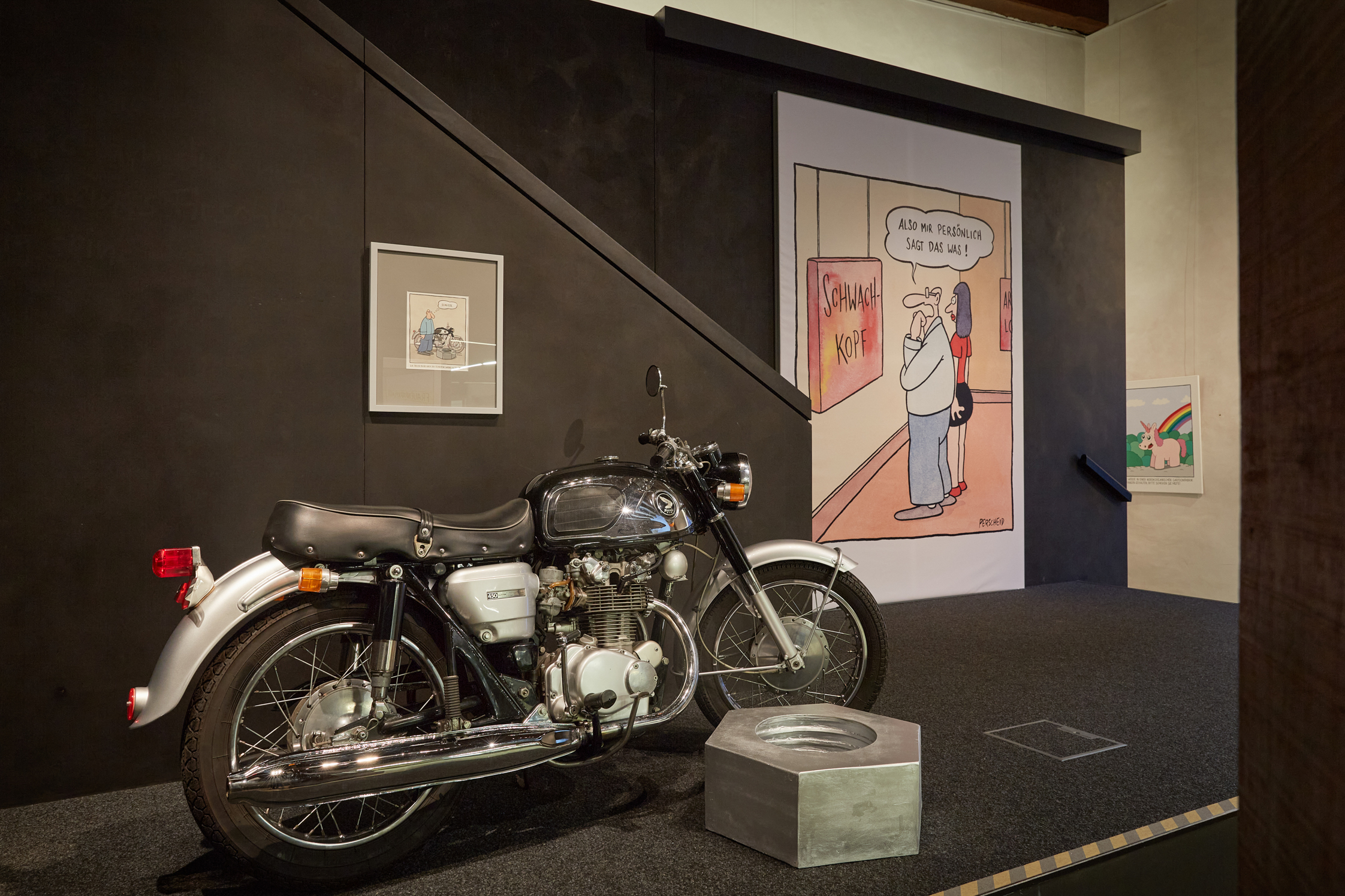 Doch Perscheids künstlerisches Schaffen reicht weit über den gezeichneten Witz hinaus, daher gewährt die Ausstellung ebenso Einblicke in sein Universum jenseits des Cartoons: Modelle, Plastiken und technische Erfindungen zeugen von seiner grenzenlosen Kreativität und Vielseitigkeit. Beispielsweise wird Perscheids Leidenschaft für Motorräder in vielen seiner Cartoons deutlich, die er im realen Leben selbst zusammenschraubte.